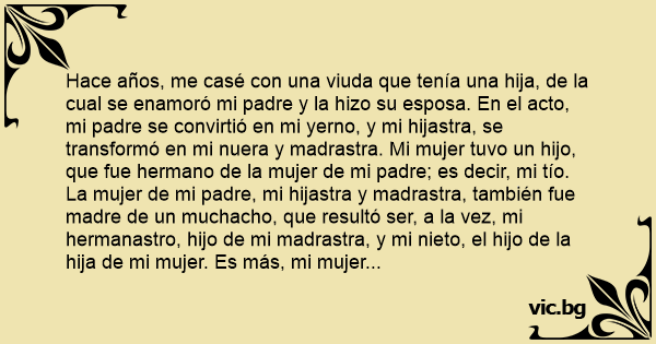 Hace años, me casé соn una viuda que tenía una hija, de la cual se enamoró mi padre y la hizo su esposa. En el acto, mi padre se convirtió en mi yerno, y mi hijastra, se transformó en mi nuera y madrastra. Mi mujer tuvo un hijo, que fue hermano de la mujer de mi padre; es decir, mi tío. La mujer de mi padre, mi hijastra y madrastra, también fue madre de un muchacho, que resultó ser, a la vez, mi hermanastro, hijo de mi madrastra, y mi nieto, el hijo de la hija de mi mujer. Es más, mi mujer resultó abuela, por ser la madre de la mujer de mi padre. De modo que no sólo soy el marido de mi mujer; sino también su nieto, por ser hermanastro de un nieto suyo. Mi mujer es mi abuela, y como el marido de la abuela de cualquier persona es su abuelo, YO SOY MI ABUELO.