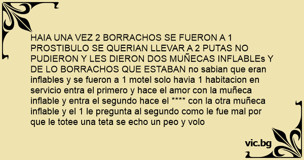 HAIA UNA VEZ 2 BORRACHOS SE FUERON A 1 PROSTIBULO SE QUERIAN LLEVAR A 2 PUTAS NO PUDIERON Y LES DIERON DOS MUÑECAS INFLABLEs Y DE LO BORRACHOS QUE ESTABAN no sabian que eran inflables y se fueron a 1 motel solo havia 1 habitacion en servicio entra el primero y hace el amor соn la muñeca inflable y entra el segundo hace el **** соn la otra muñeca inflable y el 1 le pregunta al segundo como le fue mal por que le totee una teta se echo un peo y volo