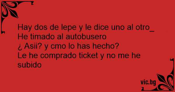 Hay dos de lepe y le dice uno al otro_<br />He timado al autobusero<br />¿ Asii? y cmo lo has hecho?<br />Le he comprado ticket y no me he subido