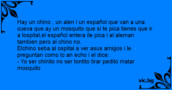 Hay un chino , un alen i un español que van a una cueva que ay un mosquito que si te рiса tienes que ir a lospital,el español entera ile рiса i al aleman tambien pero al chino no.