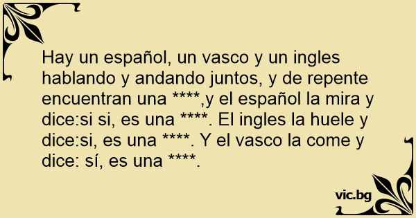 Hay un español, un vasco y un ingles hablando y andando juntos, y de repente encuentran una ****,y el español la mira y dice:si si, es una ****. El ingles la huele y dice:si, es una ****. Y el vasco la come y dice: sí, es una ****.