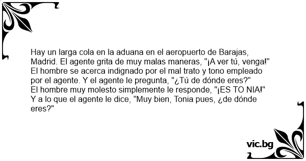 Hay un larga cola en la aduana en el aeropuerto de Barajas, Madrid. El agente grita de muy malas maneras, "¡A ver tú, venga!"