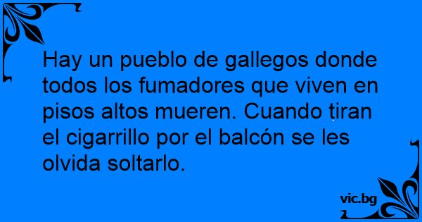 Hay un pueblo de gallegos donde todos los fumadores que viven en pisos altos mueren. Cuando tiran el cigarrillo por el balcón se les olvida soltarlo.