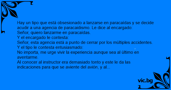 Hay un tipo que está obsesionado a lanzarse en paracaídas y se decide acudir a una agencia de paracaidismo. Le dice al encargado: