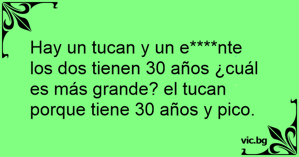 Hay un tucan y un e****nte los dos tienen 30 años ¿cuál es más grande? el tucan porque tiene 30 años y pico.