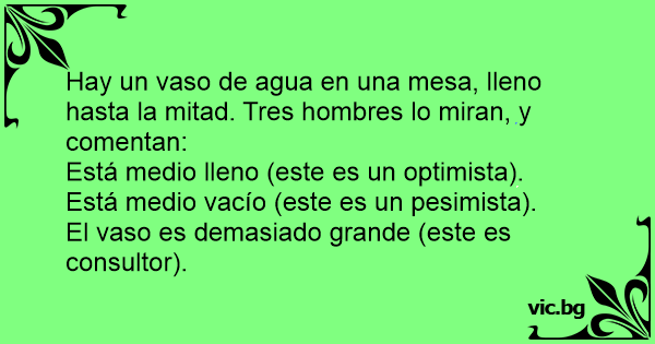 Hay un vaso de agua en una mesa, lleno hasta la mitad. Tres hombres lo miran, y comentan: