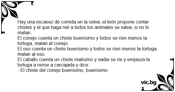 Hay una escasez de comida en la selva, el león propone contar chistes y el que haga reir a todos los animales se salva, si no lo matan.