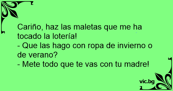 El esposo llega a su casa gritando: -¡ Querida, querida! ¡He ganado la lotería! ¡He ganado la lotería! ¡Prepara las valijas! La esposa muy contenta le contesta: -¿ Qué pongo viejo, ropa de...