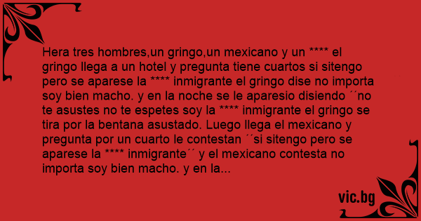 Hera tres hombres,un gringо,un mexicano y un **** el gringо llega a un hotel y pregunta tiene cuartos si sitengo pero se aparese la **** inmigrante el gringо dise no importa soy bien macho. y en la noche se le aparesio disiendo ´´no te asustes no te espetes soy la **** inmigrante el gringо se tira por la bentana asustado. Luego llega el mexicano y pregunta por un cuarto le contestan ´´si sitengo pero se aparese la **** inmigrante´´ y el mexicano contesta no importa soy bien macho. y en la noche se le aparesio disiendo ´´no te asuste no te espantes soy la **** inmigrante y el mexicano se lanso por la ventana asustado. y despues llega el **** al hotel y pregunta por un cuarto le contestan ´´si sitengo pero se aparese la **** inmigrante´´y el **** dice ´´no inporta asi demelo´´ y en la noche se le aparesio disiendo ´´no te asuste no te espantes soy la **** inmigrante y el **** le contesta ´´´NO ME ASUSTO NO ME ESPANTO ESTA VЕRGА SI LA AGUANTO´´.