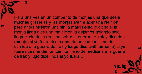 Hera una ves en un combento de monjas una que desia muchas graserias y las monjas ivan a acer una reunion pero antes hicieron una sin la maldisienta lo dicho si la monja linda dice una maldicion la dejamos ablando sola llega el dia de la reunion sobre la guerra de irak y dice deisi (monja) si yo fuera rica mandaria un camion lleno de comida a la guerra de irak y luego dice cinthia(monja) si yo fuera rica mandari un camion lleno de medicina a la guerra de irak y lugo dice linda si yo fuera rica mandaria un camion lleno de putas a la guerra de irak y lo dicho las demas monjas se ivan a ir cuando linda dice adonde van si todavia no contrato el camion