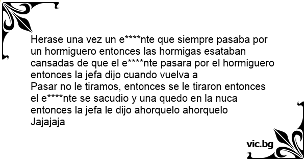 Herase una vez un e****nte que siempre pasaba por un hormiguero entonces las hormigas esataban cansadas de que el e****nte pasara por el hormiguero entonces la jefa dijo cuando vuelva a