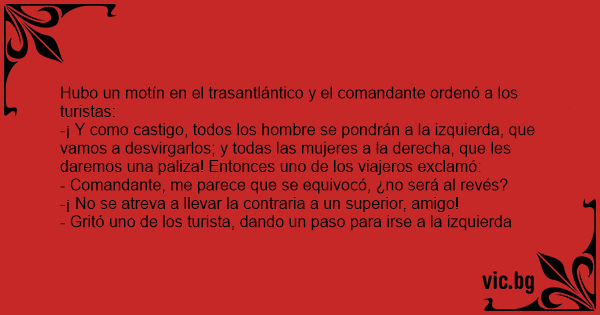 -¡ Y como castigo, todos los hombre se pondrán a la izquierda, que vamos a desvirgarlos; y todas las mujeres a la derecha, que les daremos una paliza! Entonces uno de los viajeros exclamó: