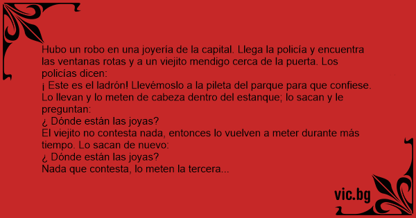 Hubo un robo en una joyería de la capital. Llega la policía y encuentra las ventanas rotas y a un viejito mendigo cerca de la puerta. Los policías dicen: