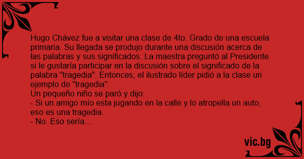 Hugo Chávez fue a visitar una clase de 4to. Grado de una escuela primaria. Su llegada se produjo durante una discusión acerca de las palabras y sus significados. La maestra preguntó al Presidente si le gustaría participar en la discusión sobre el significado de la palabra "tragedia". Entonces, el ilustrado líder pidió a la clase un ejemplo de "tragedia".