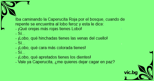 Llega caperucita donde su abuelita y le dice: - ¿Abuelita, porque tienes los ojos tan grandes? - ¡Cállate y déjame cagar en paz!