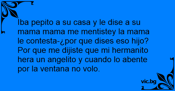 Es que pepito va consu mama y le dice eres una mentirosa y lala mama dice por que pepito por que dijiste que mi hermanitoera un angelito si si lo es y pepito dice no es sierto por que lo tire por...