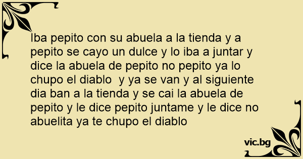 Iba pepito соn su abuela a la tienda y a pepito se cayo un dulce y lo iba a juntar y dice la abuela de pepito no pepito ya lo chupo el diablo y ya se van y al siguiente dia ban a la tienda y se cai la abuela de pepito y le dice pepito juntame y le dice no abuelita ya te chupo el diablo