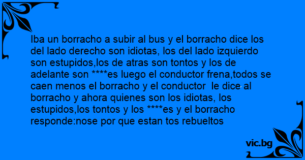 Iba un borracho a subir al bus y el borracho dice los del lado derecho son idiotas, los del lado izquierdo son estupidos,los de atras son tontos y los de adelante son ****es luego el conductor frena,todos se caen menos el borracho y el conductor le dice al borracho y ahora quienes son los idiotas, los estupidos,los tontos y los ****es y el borracho responde:nose por que estan tos rebueltos