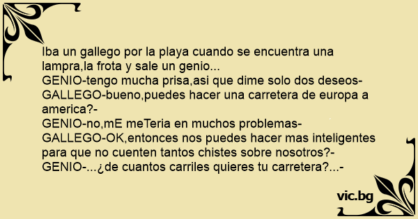 Iba un gallego por la playa cuando se encuentra una lampra,la frota y sale un genio...