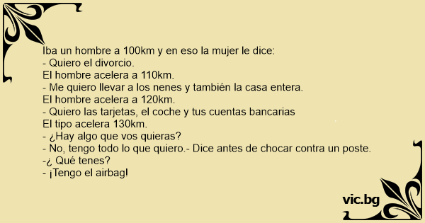 Un couple est en voiture . Tout d'un coup, la femme lance : - Je te quitte, je prend les enfants. L'homme accélère donc à 150 km/h. - Je récupère la maison. L'homme accélère donc à 170 km/h - Et j'ai vidé ton compte bancaire. L'homme accélère à 200 km/h, et la voiture se rapproche dangereusement...