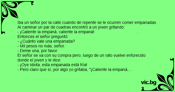 Iba un señor por la calle cuando de repente se le ocurren comer empanadas. Al caminar un par de cuadras encontró a un joven gritando:
