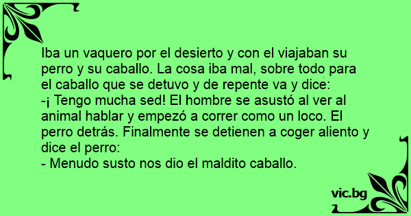 Iba un vaquero por el desierto y соn el viajaban su реrrо y su caballo. La cosa iba mal, sobre todo para el caballo que se detuvo y de repente va y dice: