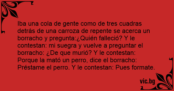 Iba una cola de gente como de tres cuadras detrás de una carroza de repente se acerca un borracho y pregunta:¿Quién falleció? Y le contestan: mi suegra y vuelve a preguntar el borracho: ¿De que murió? Y le contestan: Porque la mató un реrrо, dice el borracho: Préstame el реrrо. Y le contestan: Pues formate.