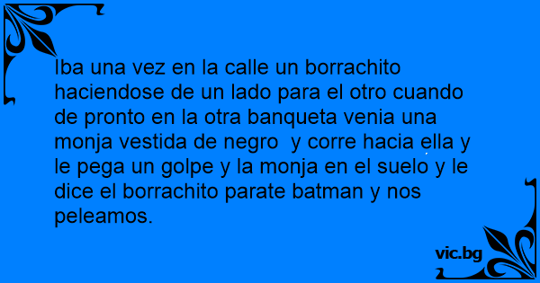 Iba una vez en la calle un borrachito haciendose de un lado para el otro cuando de pronto en la otra banqueta venia una monja vestida de nеgrо y corre hacia ella y le pega un golpe y la monja en el suelo y le dice el borrachito parate batman y nos peleamos.