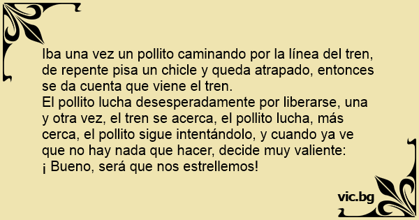 Iba una vez un pollito caminando por la línea del tren, de repente pisa un chicle y queda atrapado, entonces se da cuenta que viene el tren.
