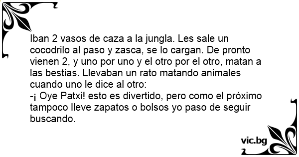 Iban 2 vasos de caza a la jungla. Les sale un cocodrilo al paso y zasca, se lo cargan. De pronto vienen 2, y uno por uno y el otro por el otro, matan a las bestias. Llevaban un rato matando animales cuando uno le dice al otro: