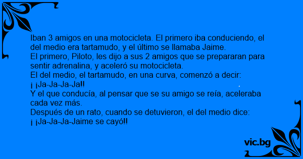 Iban 3 amigos en una motocicleta. El primero iba conduciendo, el del medio era tartamudo, y el último se llamaba Jaime.