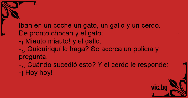 Iban en un coche un gato, un gallo y un cerdo. De pronto chocan y el gato: