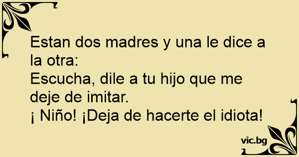 A vizinha reclama para a mãe de Joãozinho: — Seu filho passa o dia inteiro me imitando! E a mãe do Joãozinho, virando-se para ele: — O que é isso, meu filho? Pare de bancar o idiota!