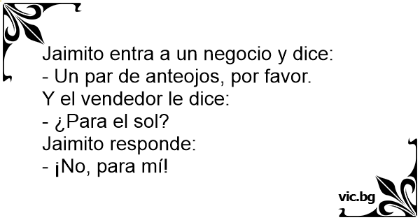 Un niño entra a una óptica y le dice al vendedor: - Quiero comprar una gafas, por favor. El vendedor le pregunta: - ¿Para el sol? Y el niño responde: - No. ¡Para mí!