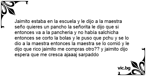 Jaimito estaba en la escuela y le dijo a la maestra seño quieres un pancho la señorita le dijo que si entonces va a la pancheria y no había salchicha entonces se corto la bolas y le puso que pchu y se lo dio a la maestra entonces la maestra se lo comió y le dijo que rico jaimito me compras otro?? y jaimito dijo espera que me cresca ajaaaj sarpaddo