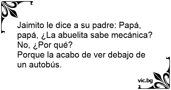 Mamá, mamá, la abuelita sabe de mecánica??? - Pues claro que no! Por qué lo dices? - Es que acabo de verla en la calle debajo de un autobús!