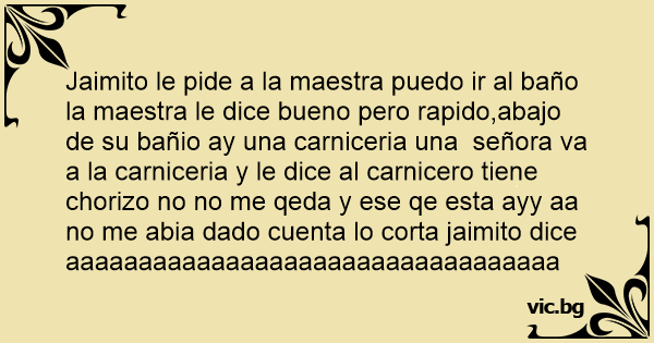 Jaimito le pide a la maestra puedo ir al baño la maestra le dice bueno pero rapido,abajo de su bañio ay una carniceria una señora va a la carniceria y le dice al carnicero tiene chorizo no no me qeda y ese qe esta ayy aa no me abia dado cuenta lo corta jaimito dice aaaaaaaaaaaaaaaaaaaaaaaaaaaaaaaaaa