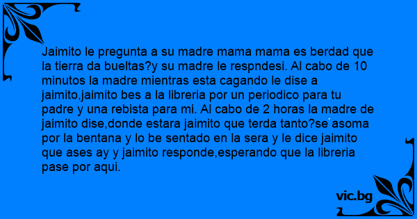 Jaimito le pregunta a su madre mama mama es berdad que la tierra da bueltas?y su madre le respndesi. Al cabo de 10 minutos la madre mientras esta cagando le dise a jaimito,jaimito bes a la libreria por un periodico para tu padre y una rebista para mi. Al cabo de 2 horas la madre de jaimito dise,donde estara jaimito que terda tanto?se asoma por la bentana y lo be sentado en la sera y le dice jaimito que ases ay y jaimito responde,esperando que la libreria pase por aqui.