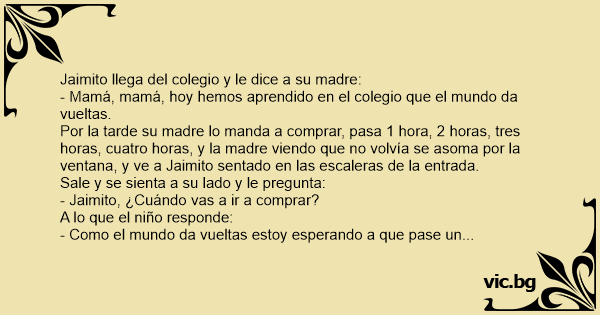 Por la tarde su madre lo manda a comprar, pasa 1 hоrа, 2 horas, tres horas, cuatro horas, y la madre viendo que no volvía se asoma por la ventana, y ve a Jaimito sentado en las escaleras de la entrada.
