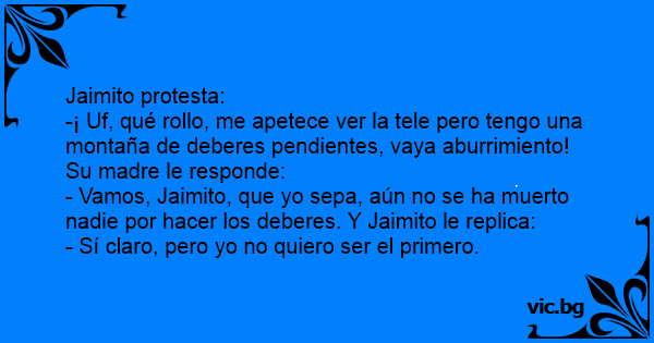 - Vamos, Jaimito, que yo sepa, aún no se ha muerto nadie por hacer los deberes. Y Jaimito le replica: