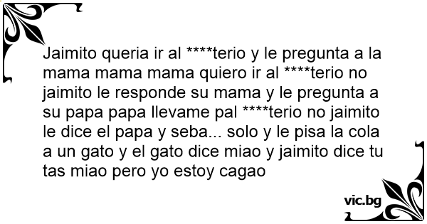 Jaimito queria ir al ****terio y le pregunta a la mama mama mama quiero ir al ****terio no jaimito le responde su mama y le pregunta a su papa papa llevame pal ****terio no jaimito le dice el papa y seba... solo y le pisa la cola a un gato y el gato dice miao y jaimito dice tu tas miao pero yo estoy cagao