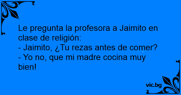 La profesora le dice a Jaimito: - Jaimito; contesta sinceramente... ¿rezas antes de cada comida? Y Jaimito responde: - No maestra, mi madre es buena cocinera!
