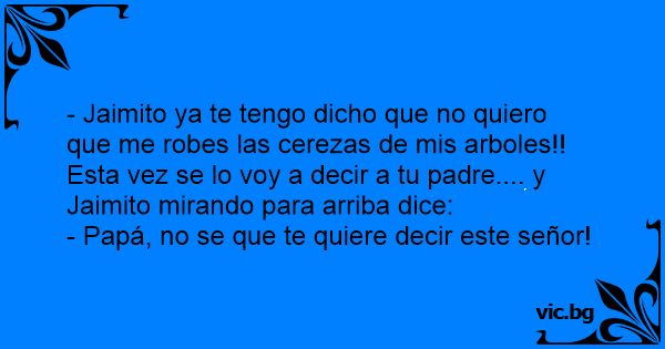 - Jaimito ya te tengo dicho que no quiero que me robes las cerezas de mis arboles!! Esta vez se lo voy a decir a tu padre.... y Jaimito mirando para arriba dice: