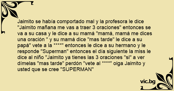 Jaimito se había comportado mal y la profesora le dice "Jaimito mañana me vas a traer 3 oraciones" entonces se va a su casa y le dice a su mamá "mamá, mamá me dices una oración " y su mamá dice "mas tarde" le dice a su papá" vete a la ****" entonces le dice a su hermano y le responde "Superman" entonces el día siguiente la miss le dice al niño "Jaimito ya tienes las 3 oraciones "si" a ver dímelas "mas tarde" perdón "vete al ****" oiga Jaimito y usted que se cree "SUPERMAN"