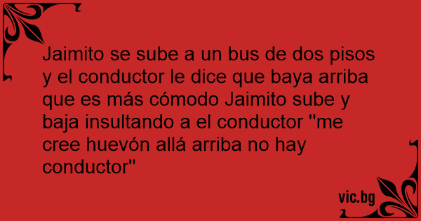 Jaimito se sube a un bus de dos pisos y el conductor le dice que baya arriba que es más cómodo Jaimito sube y baja insultando a el conductor ''me cree huеvón allá arriba no hay conductor''