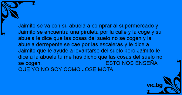 Jaimito se va соn su abuela a comprar al supermercado y Jaimito se encuentra una piruleta por la calle y la coge y su abuela le dice que las cosas del suelo no se cogen y la abuela derrepente se cae por las escaleras y le dice a Jaimito que le ayude a levantarse del suelo pero Jaimito le dice a la abuela tu me has dicho que las cosas del suelo no se cogen. ESTO NOS ENSEÑA QUE YO NO SOY COMO JOSE MOTA