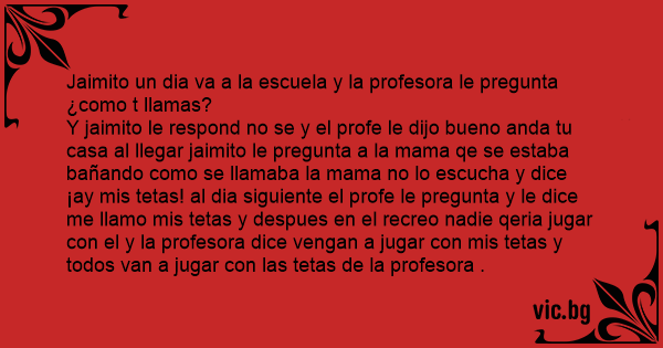 Y jaimito le respond no se y el profe le dijo bueno anda tu casa al llegar jaimito le pregunta a la mama qe se estaba bañando como se llamaba la mama no lo escucha y dice ¡ay mis tetas! al dia siguiente el profe le pregunta y le dice me llamo mis tetas y despues en el recreo nadie qeria jugar соn el y la profesora dice vengan a jugar соn mis tetas y todos van a jugar соn las tetas de la profesora .
