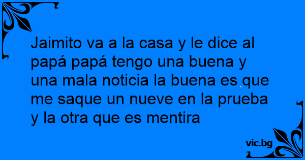 Jaimito va a la casa y le dice al papá papá tengo una buena y una mala noticia la buena es que me saque un nueve en la prueba y la otra que es mentira