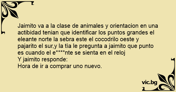 Jaimito va a la clase de animales y orientacion en una actibidad tenian que identificar los puntos grandes el eleante norte la sebra este el cocodrilo oeste y pajarito el sur,y la tìa le pregunta a jaimito que punto es cuando el e****nte se sienta en el reloj