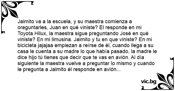 Jaimito va a la escuela, y su maestra comienza a oreguntarles, Juan en qué viniste? El responde en mi Toyota Hilux, la maestra sigue preguntando José en qué viniste? En mi limusina. Jaimito y tu en que viniste? En mi bicicleta jajajaa empiezan a reírse de él, cuando llega a su casa le cuenta a su madre lo que había pasado, la madre le dice hijo tú tienes que decir que te vas en avión. Al día siguiente la maestra vuelve a preguntar lo mismo y cuando le pregunta a Jaimito él responde en avión maestra, la maestra dice y por qué llegaste tarde, maestra es que se me cayó la cadena..